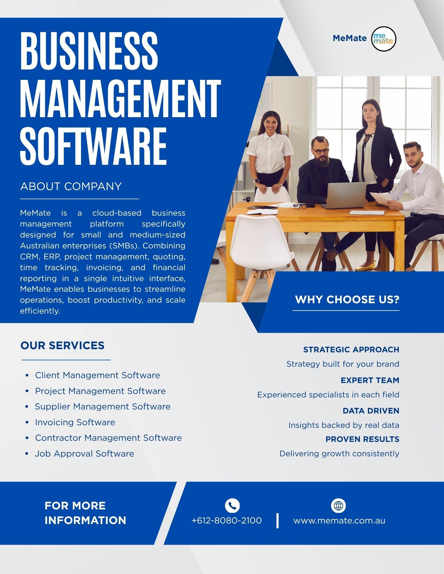 Source: www.memate.com.auMeMate Business Management Software for Smart Growth MeMate offers powerful business management software designed to simplify operations, improve productivity, and streamline workflows. From project tracking and invoicing to team collaboration and reporting, MeMate helps businesses manage everything in one place. Whether you're a startup or an established company, this business management software ensures efficiency, accuracy, and scalable growth with smart automation and real-time insights. Get Started with MeMate Today. Source: www.memate.com.au·174 Views ·0 Reviews -